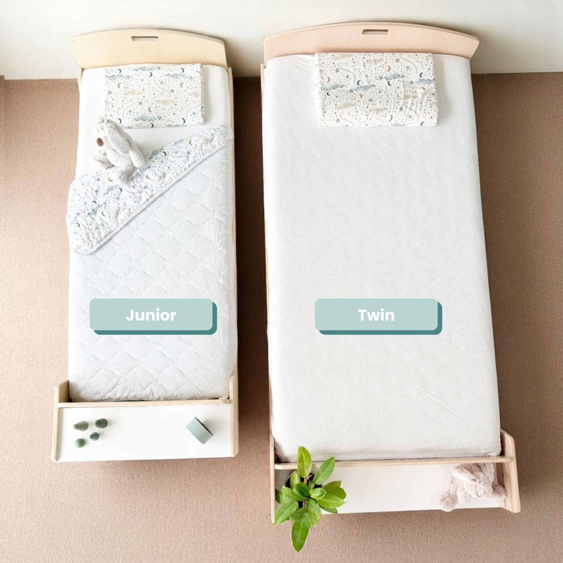 The Cherry Junior Floor Bed is the perfect middle ground between a crib and a full-size twin bed, making it the ideal transition bed for toddlers and young kids. When little ones start climbing out of their cribs, it’s not just unsafe – it’s also a sign they’re ready for more independence. But a twin bed can feel too big and overwhelming, so the junior size offers the perfect fit. With its low profile, it minimizes fall risk while still providing a spacious, cozy sleep space that can last until they’re 8 years old or more. Made with independence and self-confidence in mind, it’s designed to help kids safely get in and out on their own, fostering self-sufficiency from an early age.